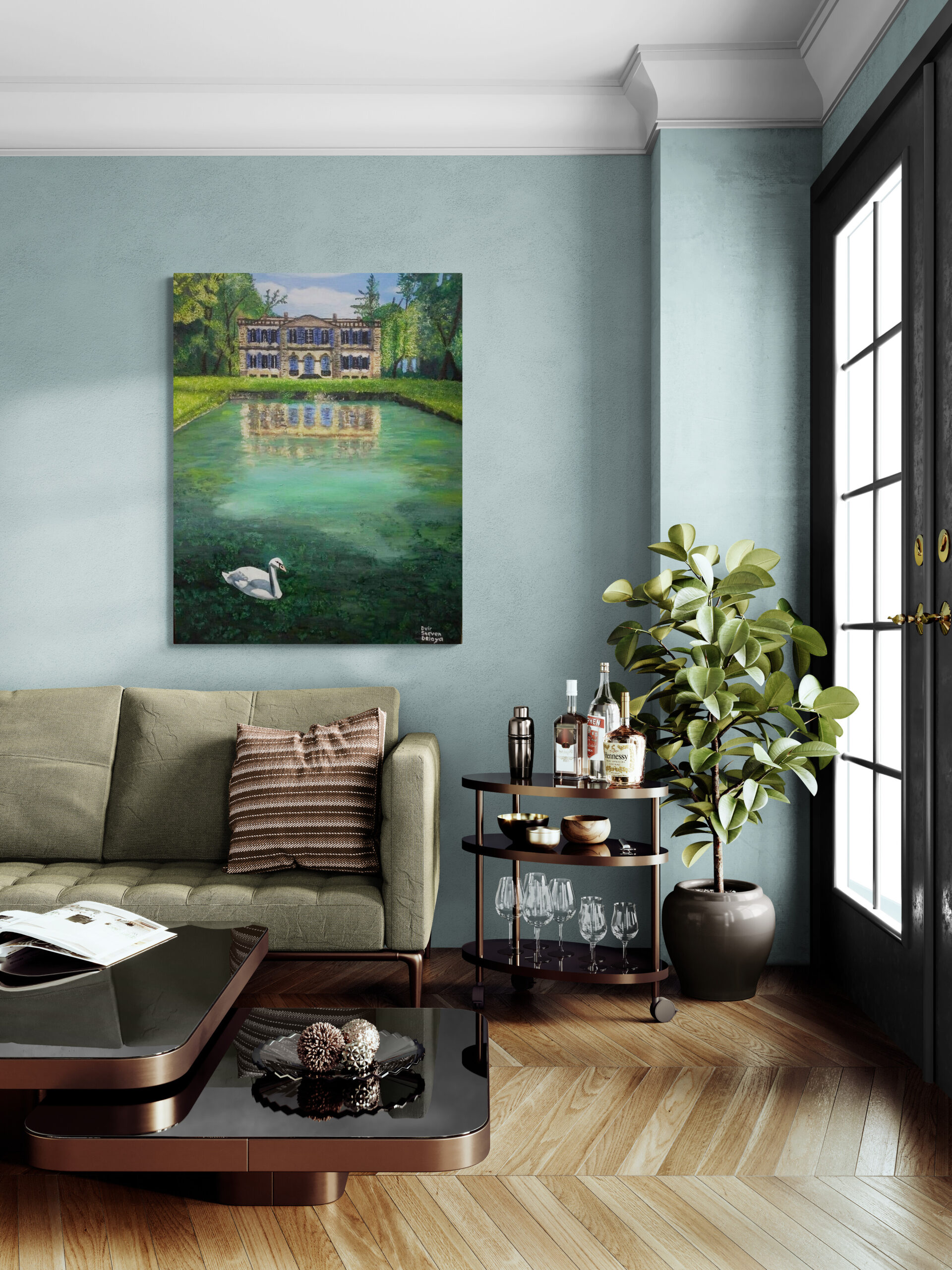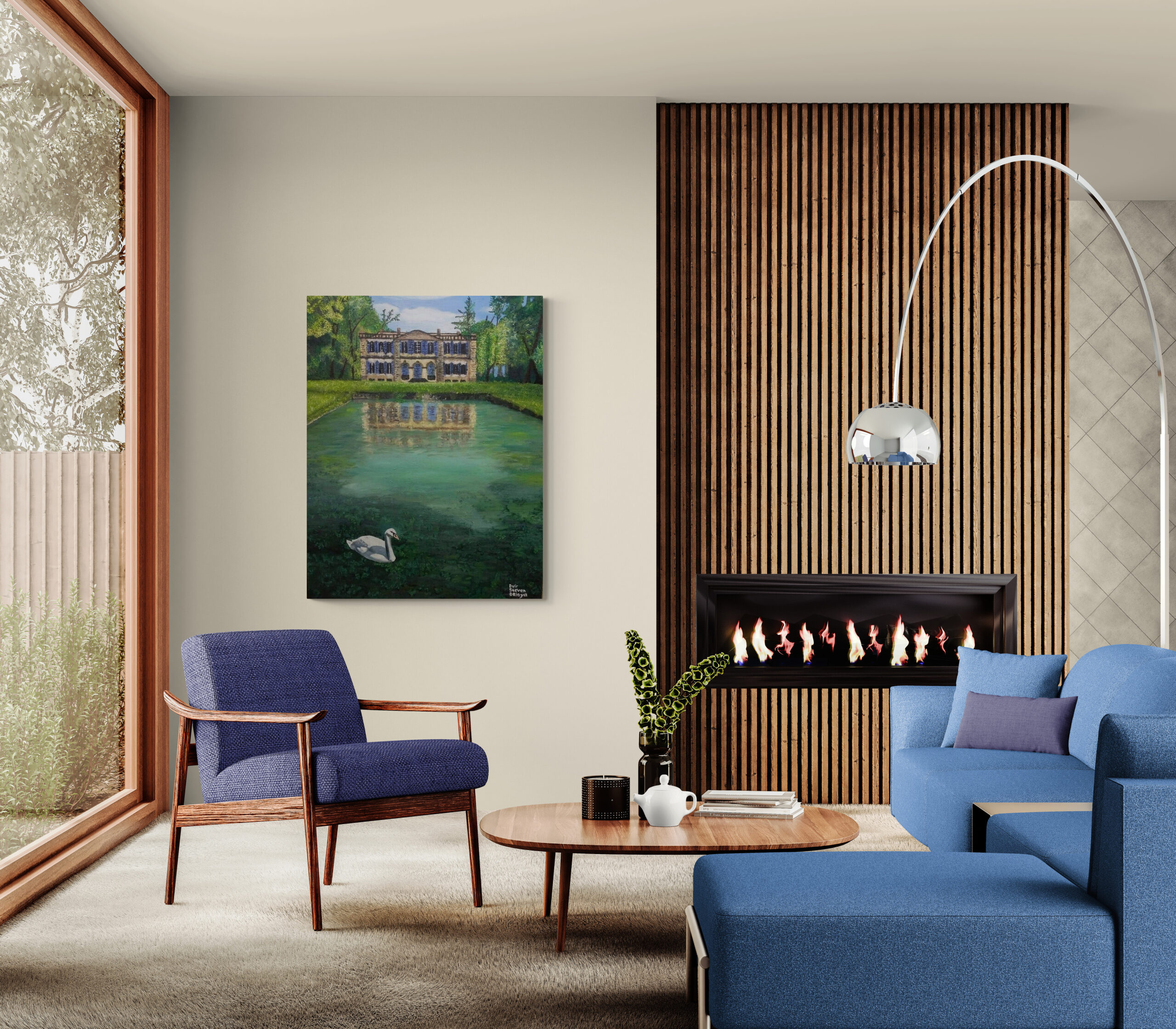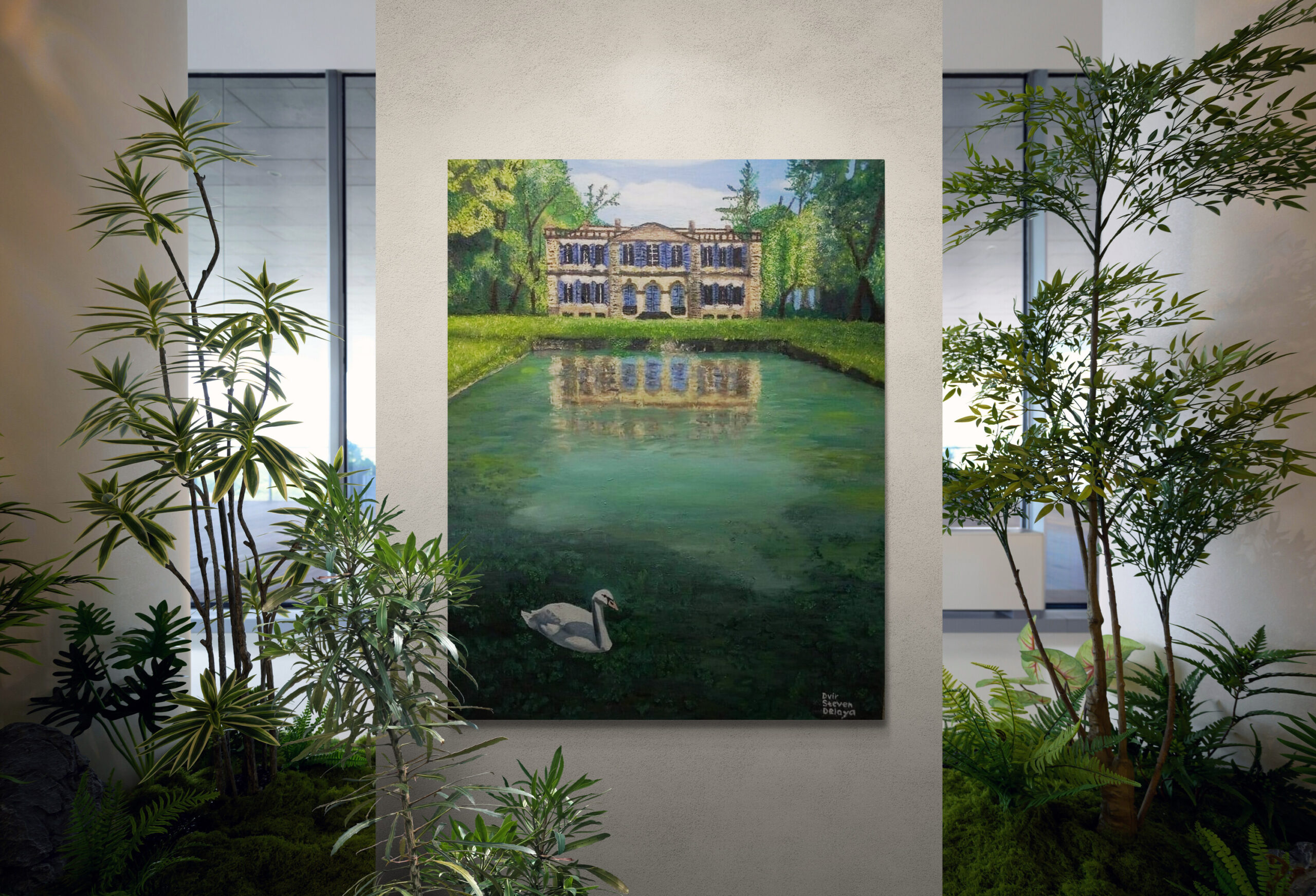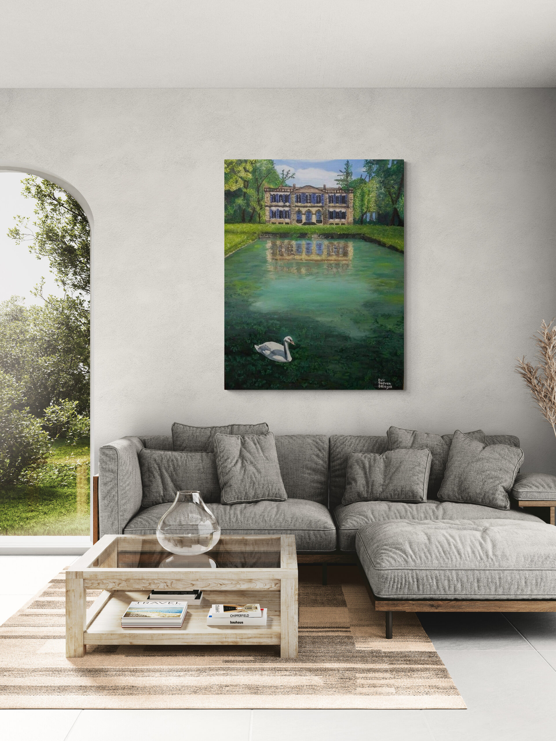 ציור יפייפה נוף מרהיב שמשתלב יפה בכל חלל שילוב של מבנה וטבע אך התיאום בניהם מושלם